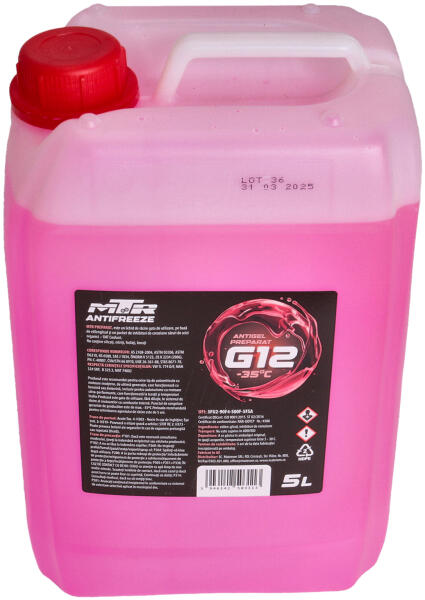 Antigel diluat MTR G12 este un lichid de racire gata de utilizare, formulat pe baza de etilenglicol si un pachet de inhibitori de coroziune saruri de acizi organici - OAT Coolant. Nu contine nitriti, amine, fosfati si borati. Produsul este recomandat pentru orice tip de autovehicule cu motoare moderne, de ultima generatie, care functioneaza cu benzina sau motorina, inclusiv pentru autoturisme cu motoare ultra performante care functioneaza la turatii si temepraturi inalte. Combina o protectie foarte buna impotriva coroziunii si a cavitatii aliajelor din aluminiu cu o excelenta protectie pentru metalele grele si neferoase. Este compatibil cu piesele din cauciuc sau plastic utilizate la sistemele de racire. Produsul este gata de utilizare, fara dilutie, in sistemul de racire al motoarelor cu combustie interna, punctul de congelare garantat de producator este de max -35 C. Corespunde normelor: ASTM D3306; ASTM 6210; BS6580; JIS K2234; ONNORM V5123; AFNOR NF R15-602 Respecta cerintele specificatiilor: VW TL 774-D; VW TL 774-F; DAF MAT 74002; MAN 324 TYPE SNF; MB 325.3 Utilizare: Produsul este recomandat pentru orice tip de instalatie racire ale motoarelor autovehiculelor, inclusiv autocamioane, autobuze, tractoare etc. Punct de congelare: max -35 CTehnologie OAT (Organic Acid Technology). Compatibil cu masini de productie incepand cu sfarsitul anilor 1990. Are o concentratie mai mare de glicoli si o durata de folosinta mai mare decat G11. Nu contine nitriti, amine, fosfati, silicati. Ofera o foarte buna protectie la aluminiu. Culoare roz. STANDARDE de CALITATE si SPECIFICATII TEHNICEAudi G12 - TL 774D VW G12 - TL 774D Audi G 012 A8D A1 VW G 012 A8D A1 Seat G 012 A8D A1 Skoda G 012 A8D A1Opel 1940 663Volvo 1381080MASINI pt care se folosesteAUDI- toate modelel - 1996 -2007FIAT-toate modelele - dupa 2005OPEL-toate modelele - dupa 2001SKODA-toate modelele - 1998 -2008VOLKSWAGEN-toate modelele - 1997-2008